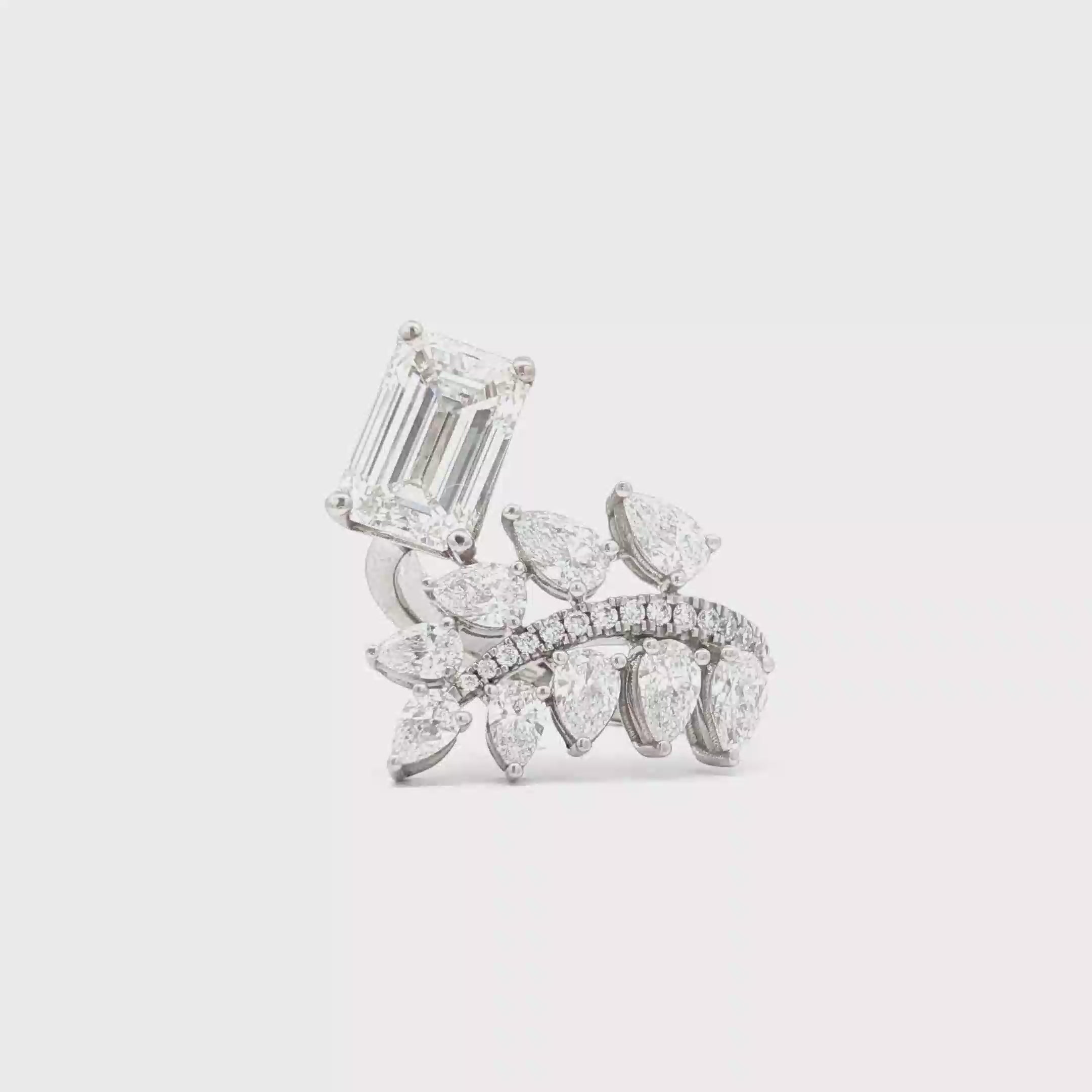 A striking blend of nature and luxury, this ring features a stunning 2.5ct emerald-cut lab-grown diamond complemented by a delicate floral motif, all set in radiant 18K gold. The unique design balances bold sparkle with intricate artistry, making it a truly stylish statement piece.