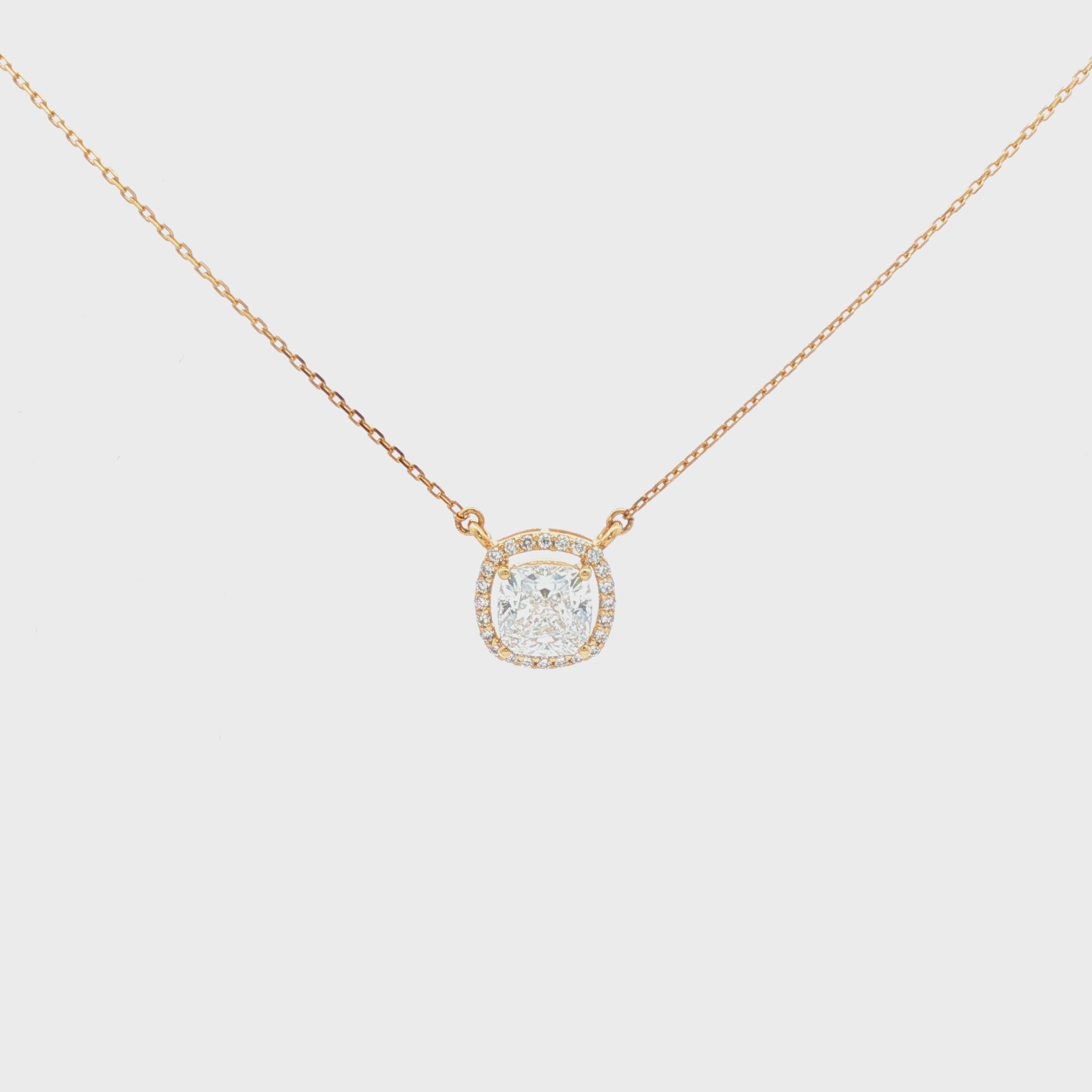 Exquisite and sophisticated, this yellow gold diamond necklace showcases a cushion cut diamond with brilliant cutting style. The elegant design and delicate setting make it a timeless piece for any jewelry collection. A perfect balance of classic charm and modern allure, this necklace adds a touch of luxury to any outfit.